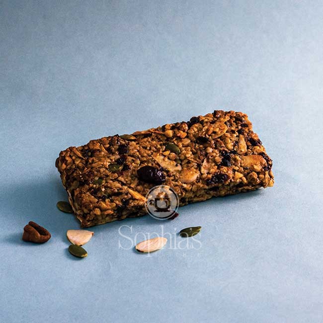 Paleo Bar is made fresh in house at Sophia’s Kitchen! An exclusive Sophia’s original! Rich In Omega 3 - High Fiber - Gluten Free Vegan - High Protein - No Preservatives, Walnuts, Pecans, Almonds, Flaxseed, Chia Seen, Coconut Oil & Cranberry With Hint Of Honey.