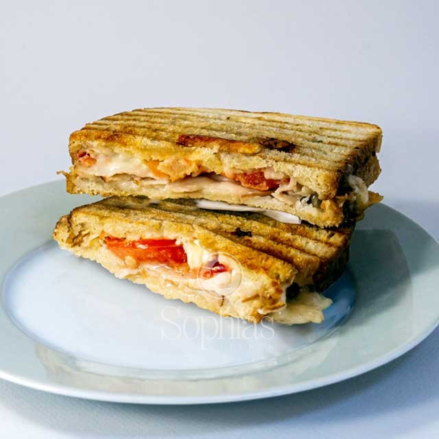Turkey Swiss Panini is a freshly Sliced Turkey Breast With a roma Tomato And Fresh Swiss Cheese, then Grilled on Sourdough Bread, in a Panini press of course!